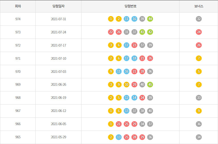 Source: www.newsworks.co.kr 7월 31일 974회 로또 당첨 번호는 1, 2, 11, 16, 39, 44 번이며, 보너스번호는 32번 입니다.